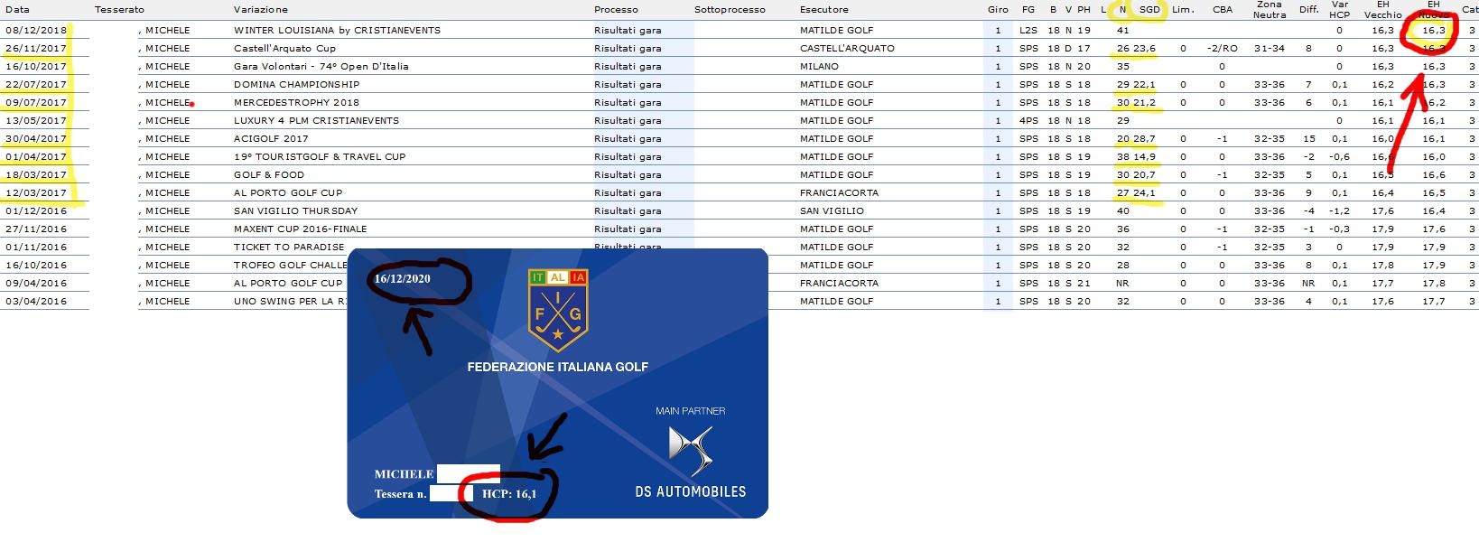 @Alle_Uhr secondo me il nuovo sistema è più equo e meno condizionato dal risultato casuale ; io 2 anni fa ho giocato male tutto l’anno, ma ho azzeccato una gara da 41 che mi ha coperto 15 virgole (e quasi tutte con meno di 30 punti), con il nuovo sistema queste storture non dovrebbero esserci. Io me lo sto calcolando da un paio d’anni e l’andamento non è molto distante dal vecchio EGA, dovrei passare da 11.8 a 12.4 e son sempre stabile intorno a quei numeri anche se alla prox gara salirò un po’ perché mi “scade” un 1216 Dicembre 2020 alle 8:56 #33177Per vedere il nuovo handicap, loggatevi nella pagina della federgolf, area riservata e cliccate in alto a destra su “stampa tessera” e vedrete il nuovo handicap.
