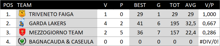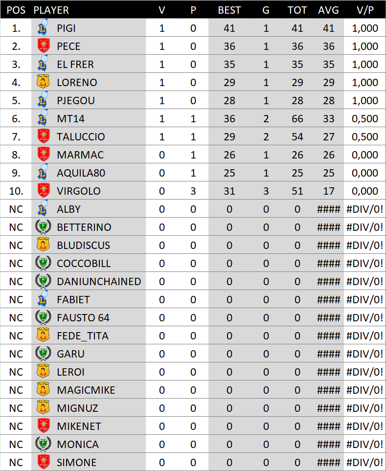 Ovviamente la classifica a squadre è strutturata su un minimo di incontri (6 per giocatore, 6×5=30), se Mignuz e soci saranno così bravi da vincere le altre 29 ovviamente non li potrete mai raggiungere, perchè la loro percentuale sarà sempre 1.