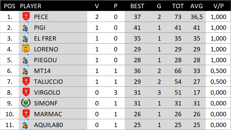 1. Inverno si gioca come si gioca, accoppiamenti random mano a mano che ci si iscrive. Alla fine dell’inverno classifica azzerata, con punti bonus in base alla classifcia invernale.