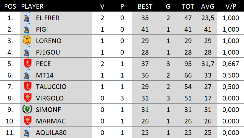 19 Febbraio 2018 alle 9:01 #22801Vincendo la sfida il Frer scalza il Pece dal primo posto della classifica e riconquista la leadership.