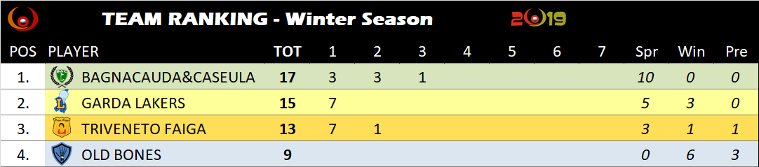 Per la classifica a squadre, come nella Spring Season, i migliori 7 score.