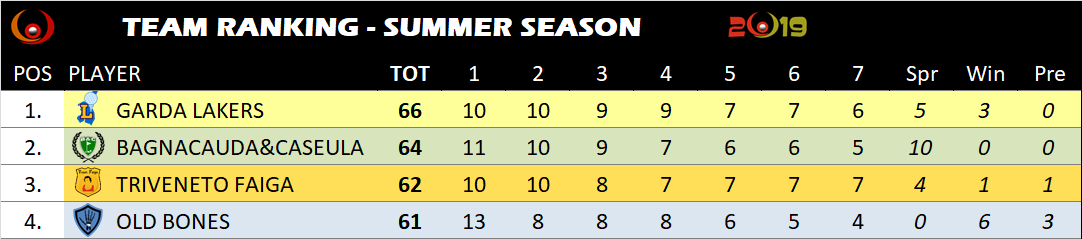 Ribaltone nella classifica a squadre, ma lotta sempre aperta. Ora al Numero 1 i Garda Lakers. Nota di merito sempre al Pece, che da solo riesce a tenere in corsa gli Old Bones.
