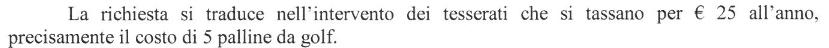 28 Novembre 2017 alle 12:57 #19820Spero che non abbia sparato troppo in alto, in realtà avrebbe voluto dire “faremo il possibile per aumentare il numero dei nostri tesserati”, in pratica stanno facendo ancora poco (le poche manifestazioni golfistiche “cittadine” non faranno miracoli) o meno di poco con poche idee (tranne quella di far soldi sui soliti), un po’ come quando i politici spiegano come (non) risolvono l’evasione fiscale.