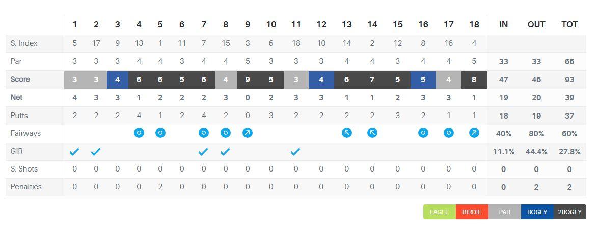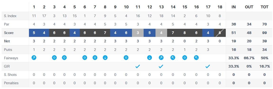 Le seconde 9 portano altri 19 punti, per un totale di 39. Niente male, tante recriminazioni per errori evitabili ma bisogna ricordare anche agli episodi fortunati, tipo il primo tee shot, quindi alla fine credo che lo score sia giustamente esemplificativo del gioco.