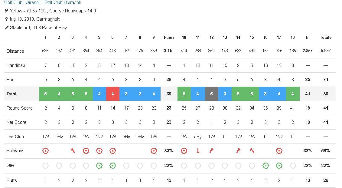 Chiudo in 80 colpi, con un solo doppio bogey e senza X; 41 punti netto, 27 lordo. 7 fairway su 12 (5/6 nelle prime 9), 4 GIR, 26 put.