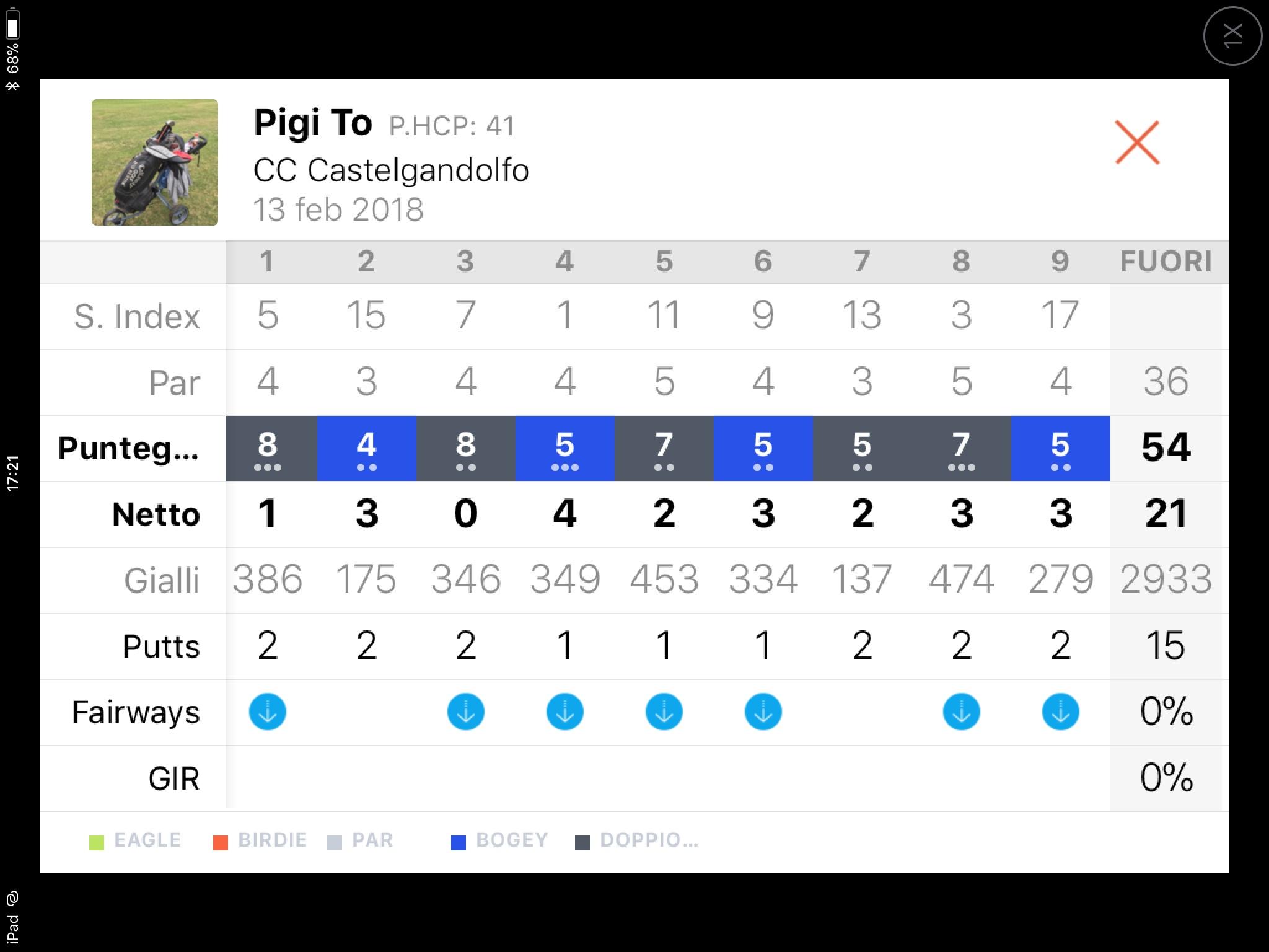 Oggi ho di nuovo giocato in maniera decente. Ho giocato le mie 9 buche in 54 colpi con 15 putts e 21 punti totali.