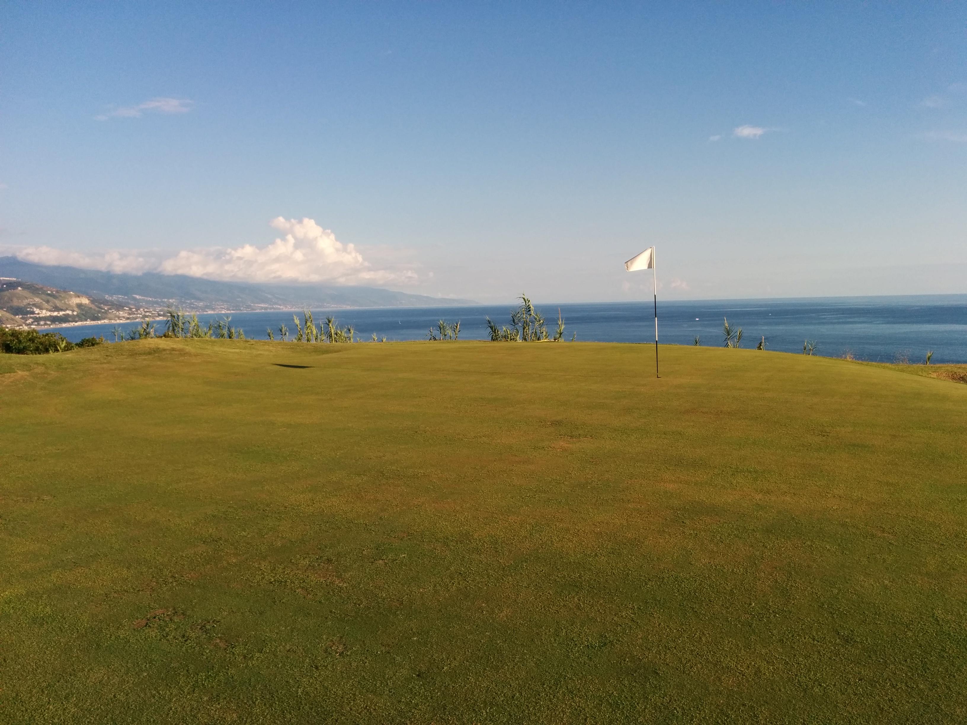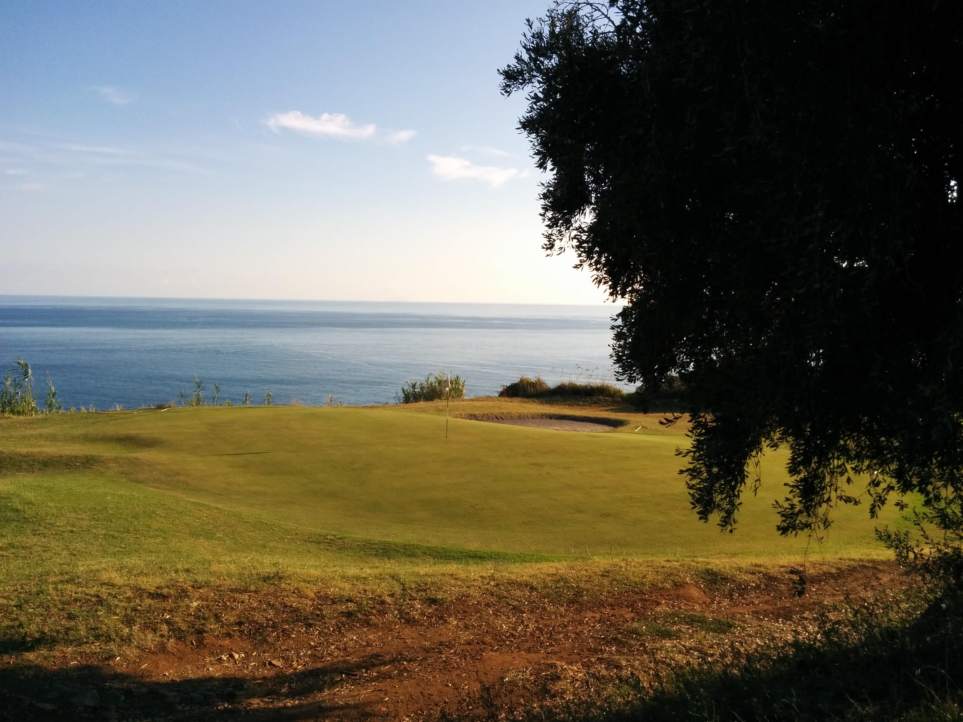 Buca 8, corto par 4 con FL a dx, metà buca è stretta e protetta da alberi, mentre l’altra metà è scoperta e permette una vista favolosa sul mare. Dato che ho la strettoia sul primo tiro e non ho voglia di finire FL, vado di ferro 7 in (presunta) sicurezza. Pallina salva, ma che finisce sotto un grande albero. Mi avvicino alla pallina e mi passa davanti quella che ho supposto essere una biscia (!). Scampato il pericolo non posso fare altro che un colpo a correre per evitare le fronde basse dell’albero. Con il terzo sono a bordo green (sbaglio con le distanze, il Garmin spesso mi ha dato delle distanze su cui l’occhio non è convinto e più di una volta ho sbagliato il ferro). Approccio e due putt ed è di nuovo doppio bogey. Ho raggiunto i ragazzi che avevo davanti (sono sul te della 9 anche loro noto essere dei rattonatori provetti) ed ho il tempo di fare un po’ di foto con il panorama della costa calabra che ho davanti.