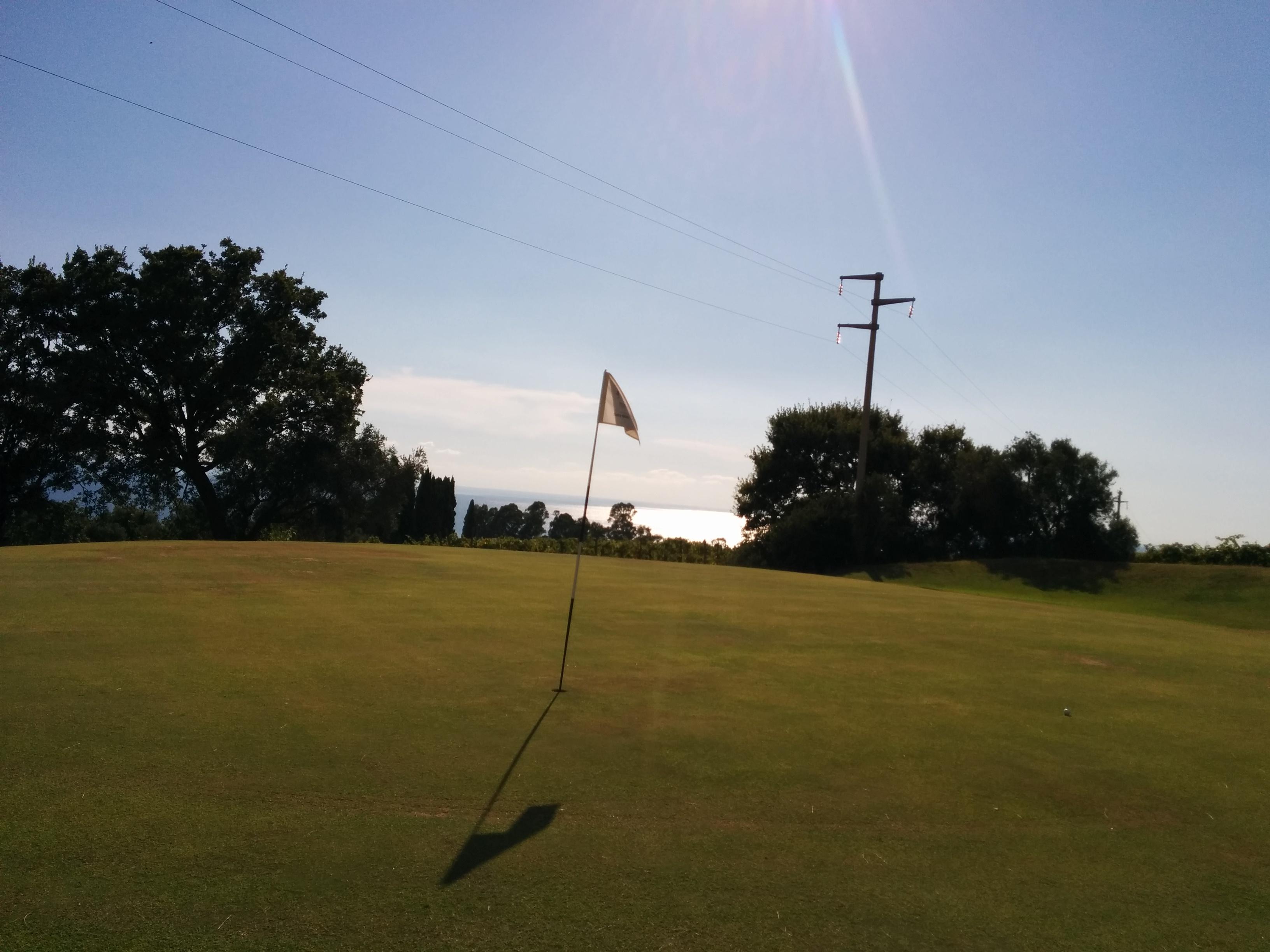 Partenza alle 16:15, un bel caldo afoso dopo una (per fortuna) breve pioggerellina. Il percorso è praticamente deserto (raggiungerò due ragazzi alla 9) per cui so già che, nei casi di buche X, continuerò a giocare medal senza alzare la pallina.Buca 1, par 4 da 360 m, leggero dogleg a sx, strettoia a ridosso del green. Ferro 5 a sinistra del fairway, ho delle piante d’olivo davanti e devo fare layup, peccato che la metto in un punto ancora peggiore sull’altra sponda del fairway, sono in rough con la palla quasi ad altezza ginocchia. Dovrei essere furbo e dichiararla ingiocabile ed invece provo per ben tre volte (…), praticamente è già x, chi ben comincia. Unica consolazione due putt su green molto diversi dai miei soliti con il terribile mallet. Anche il panorama che si gode da questo green e piuttosto consolante.