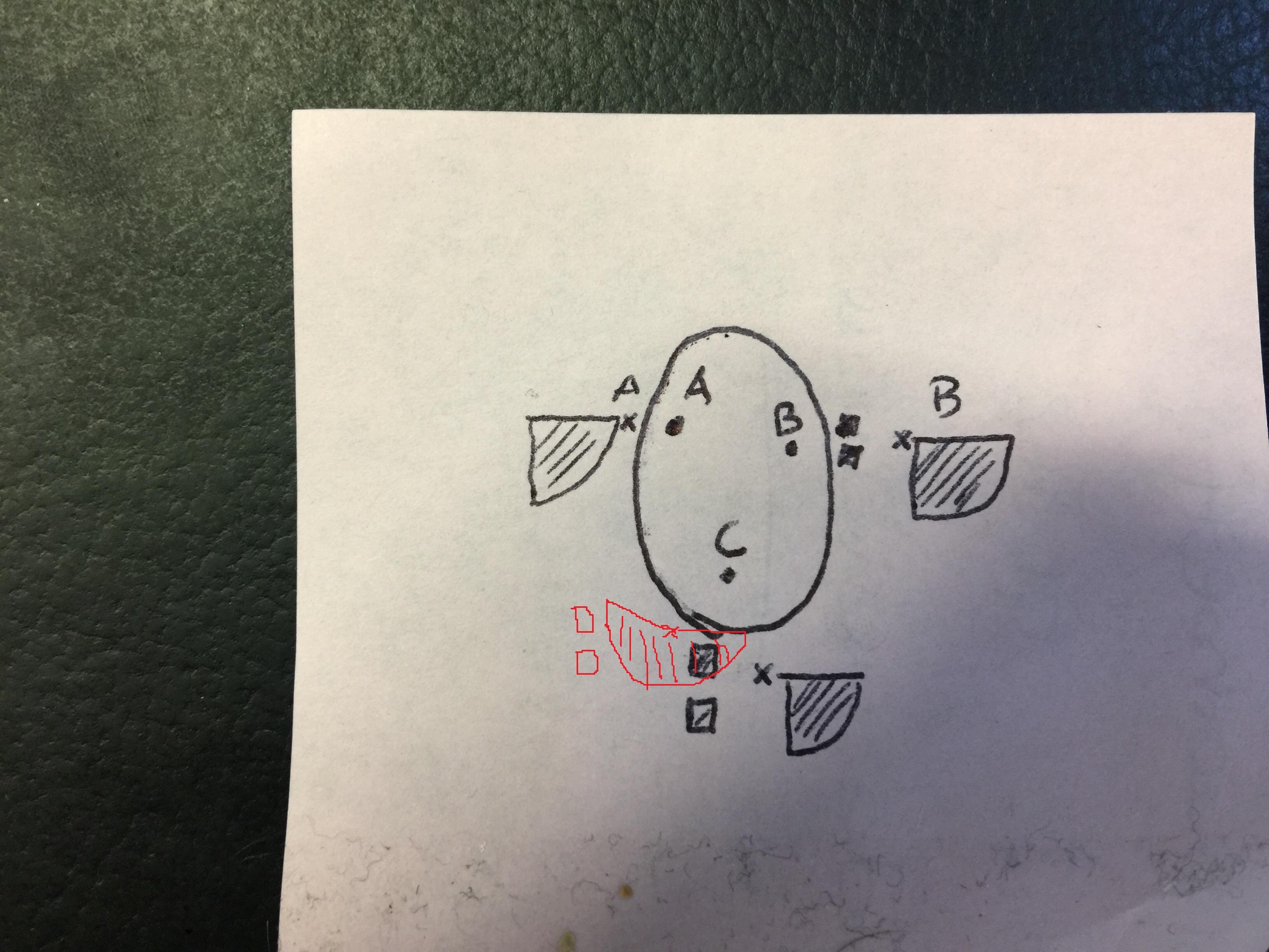 E’ corretto questo schema, dove i quadratini sono i piedi e la x la testa del bastone all’address? (per la posizione C il punto più vicino non è esatto, ma abbiate pazienza, ho fatto il classico e non l’artistico