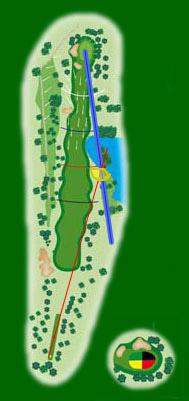 la linea rossa è la traiettoria del tuo tee shot, quella più spessa blu sarebbe la linea punto d’ingresso-bandiera, l’area gialla invece è l’area di due bastoni (dal punto di ingresso).
