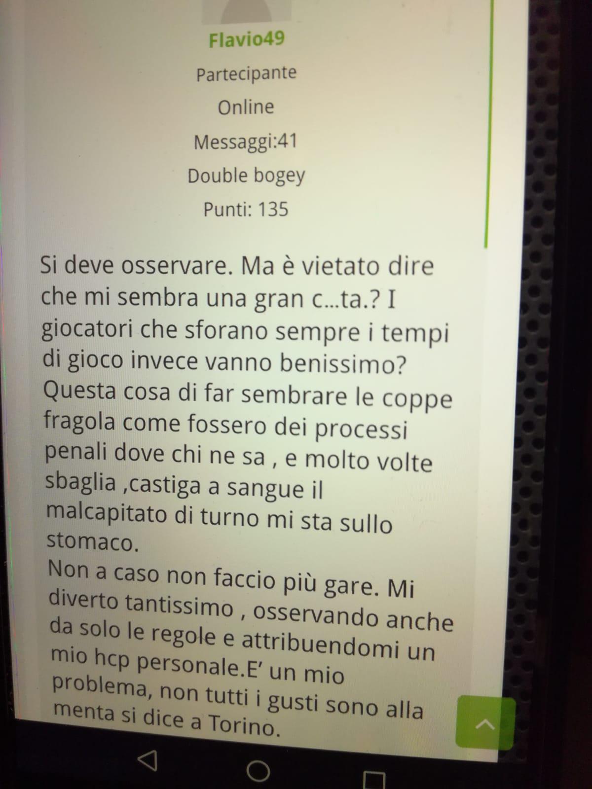 31 Gennaio 2019 alle 0:34 #28611Rimane un gran C…ta, regola da cambiare. Il caddie non ha certo favorito il giocatore. Ogni tanto un pò di buonsenso aiuterebbe.